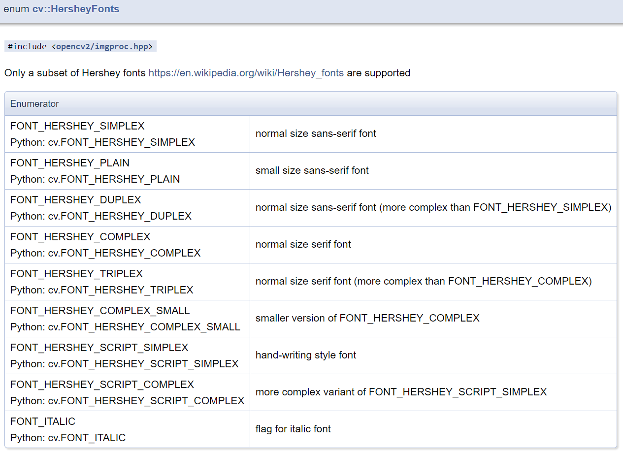 putText() 함수는 img 영상의 org 위치에 text로 지정된 문자열을 출력합니다. 이때 사용할 폰트 종류는 fontFace 인자로 지정할 수 있고, faceScale 인자를 이용하여 폰트 크기를 조절할 수 있습니다. fontFace 인자에는 HersheyFonts 열거형 상수 값을 지정할 수 있으며, 그 종류는 다음과 같습니다.