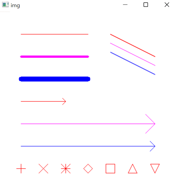cv::line(img, cv::Point(250, 70), cv::Point(350, 120), cv::Scalar(255, 0, 255), 1, cv::LINE_8);