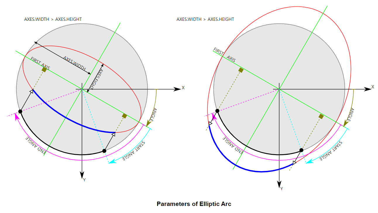 타원을 그리는 방식은 원보다는 조금 더 복잡합니다. ellipse() 함수를 통해 다양한 형태의 타원 또는 타원의 일부인 호를 그릴 수 있습니다. 타원의 크기는 axes 인자를 통해 지정합니다. axes 인자는 Size 타입을 사용하며, x축 방향 타원의 반지름과 y축 방향 반지름을 지정합니다. angle 인자에 0이 아닌 값을 전달하면 회전된 타원을 그릴 수 있습니다. startAngle과 endAngle 인자를 적절하게 이용하면 호를 그리는 용도로 사용할 수 있습니다. thickness 인자는 타원 외곽선 두께를 나타내며 이 값을 -1 또는 FILLED로 설정하면 내부를 채운 타원 혹은 호를 그립니다.