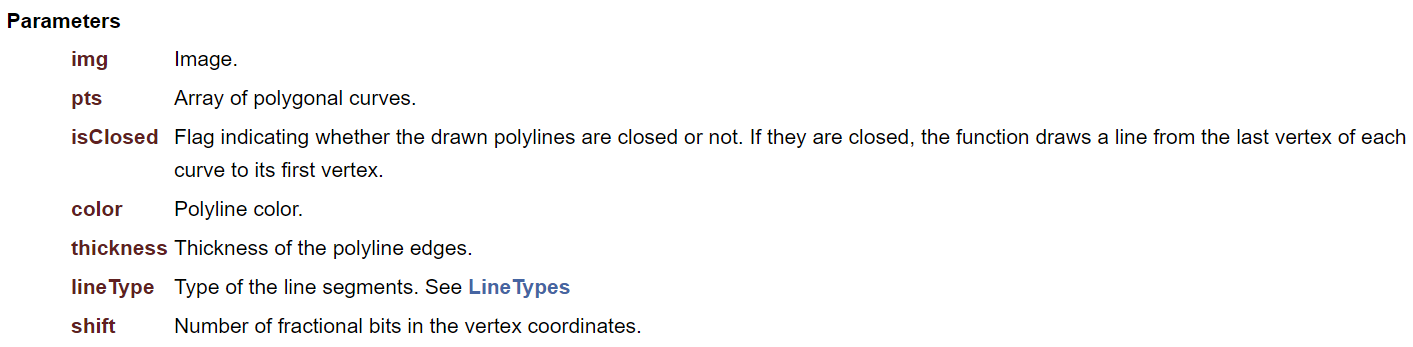 cv::polylines(img, pts, true, cv::Scalar(255, 0, 255), 2);