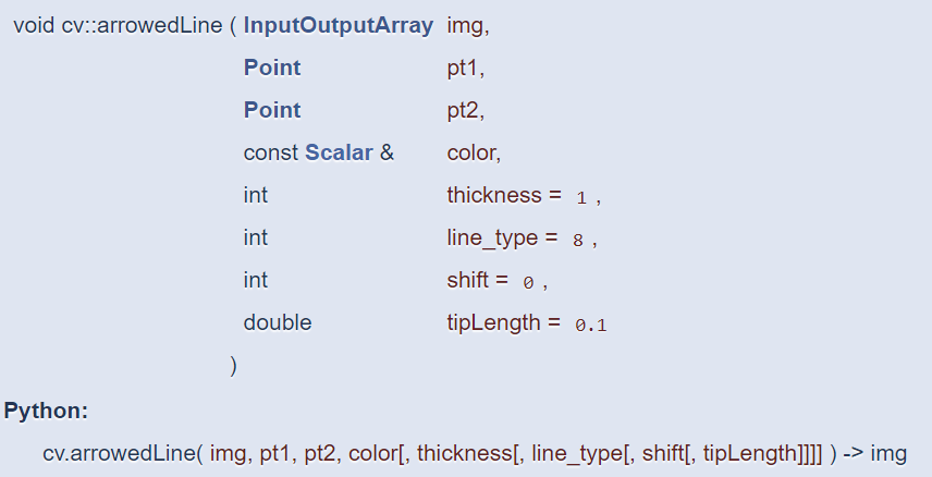 cv::arrowedLine(img, cv::Point(50, 200), cv::Point(150, 200), cv::Scalar(0, 0, 255), 1);