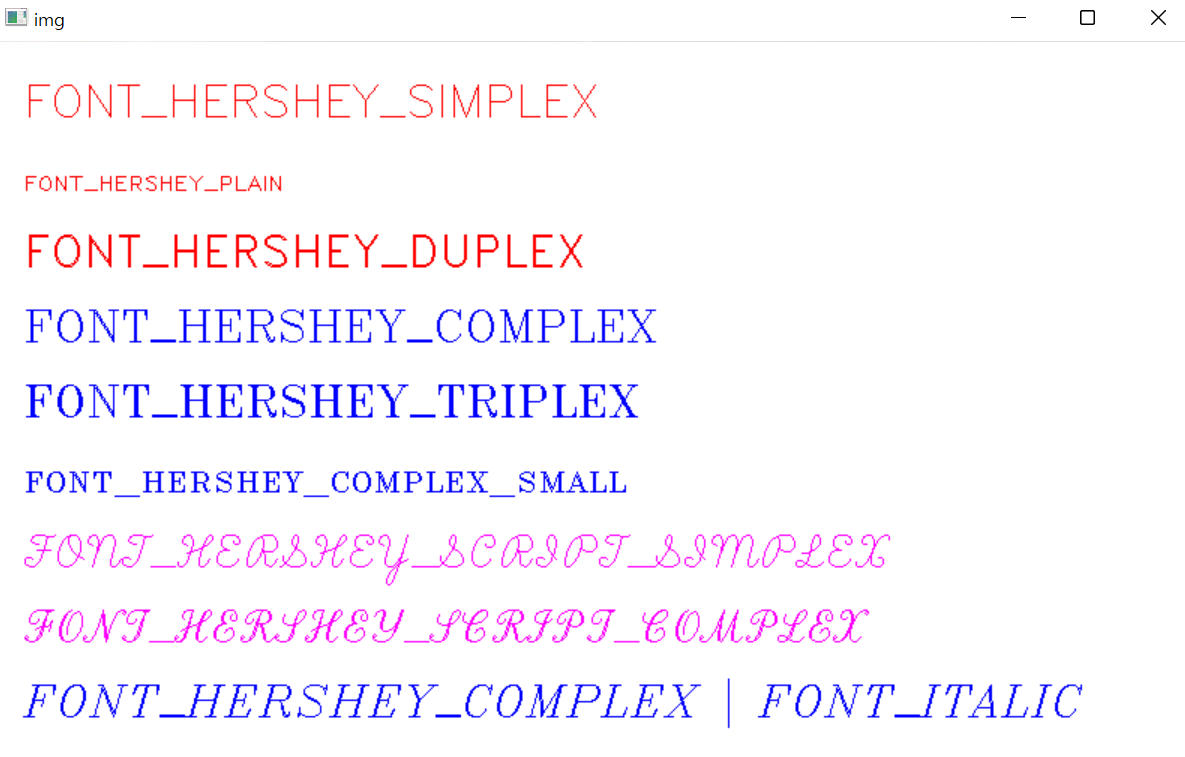 cv::putText(img, "FONT_HERSHEY_COMPLEX_SMALL", cv::Point(20, 300), cv::FONT_HERSHEY_COMPLEX_SMALL, 1, cv::Scalar(255, 0, 0));