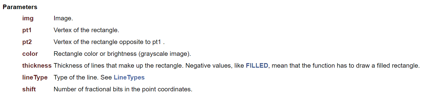 rectangle() 함수는 위와 같이 두 가지 형식이 있습니다. 위의 파라미터 정보는 사각형의 두 정점(반대 위치의)을 받는 버전의 함수 인자입니다. 다른 형식으로는 Rect 정보를 입력받아 그리는 버전입니다.
