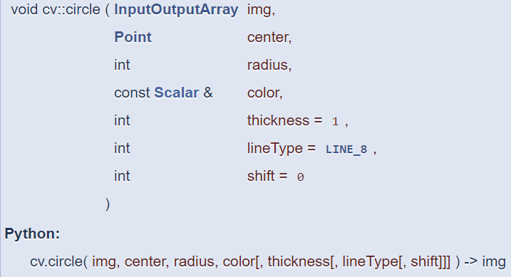 OpenCV에서 원을 그리는 함수는 circle() 입니다. 원을 그리기 위해서는 원의 중심점 좌표와 반지름을 지정해야 합니다.