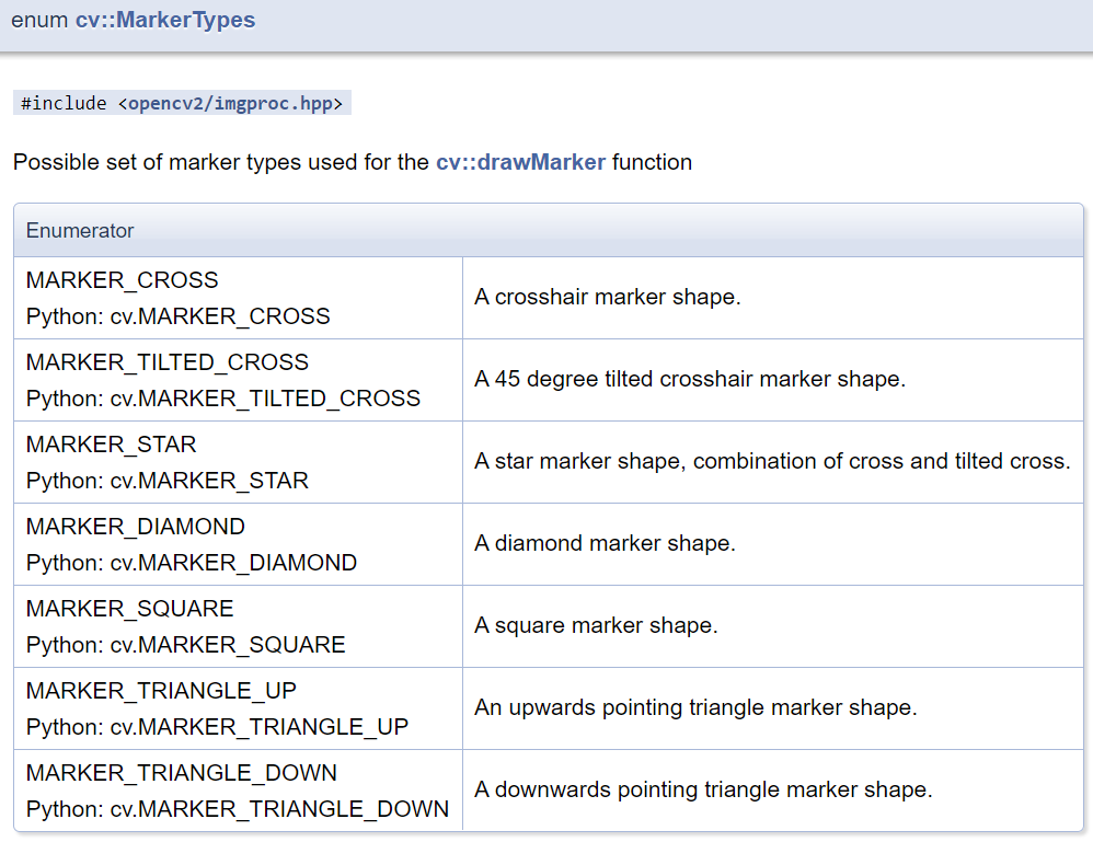 OpenCV 함수 중 drawMarker() 함수는 직선 그리기 함수를 이용하여 다양한 모양의 마커를 그립니다.