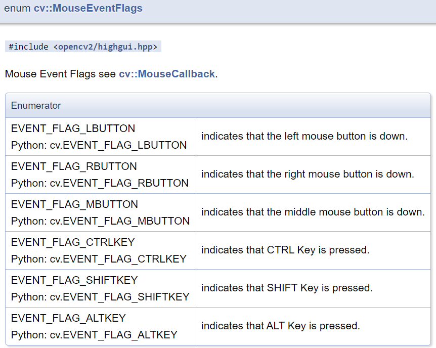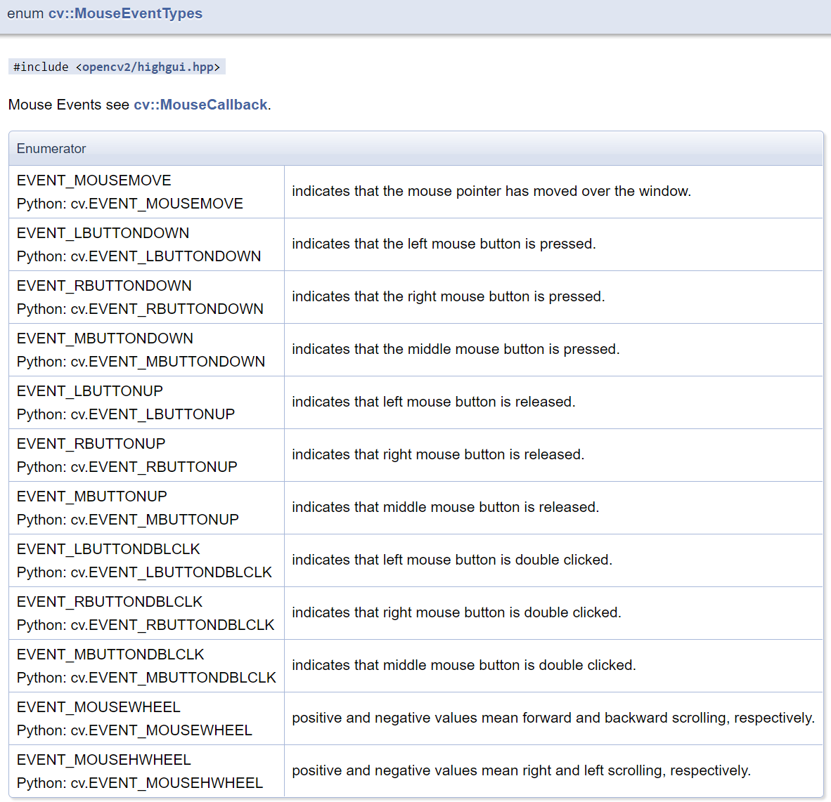 즉, 4 개의 정수형과 하나의 void* 타입을 인자로 가지며, void를 반환형으로 가집니다. 마우스 콜백 이름은 onMouse가 아닌 다른 이름을 사용해도 됩니다. 콜백 함수의 첫 번째 인자 event에는 MouseEventTypes로 정의된 열거형 상수 중 하나가 전달되며, 그 값과 의미는 다음과 같습니다.