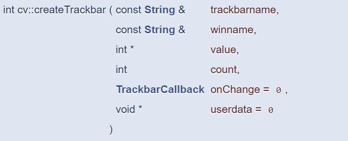 OpenCV에서 트랙바를 생성하려면 createTrackbar() 함수를 사용하며, 이 함수의 원형은 다음과 같습니다.