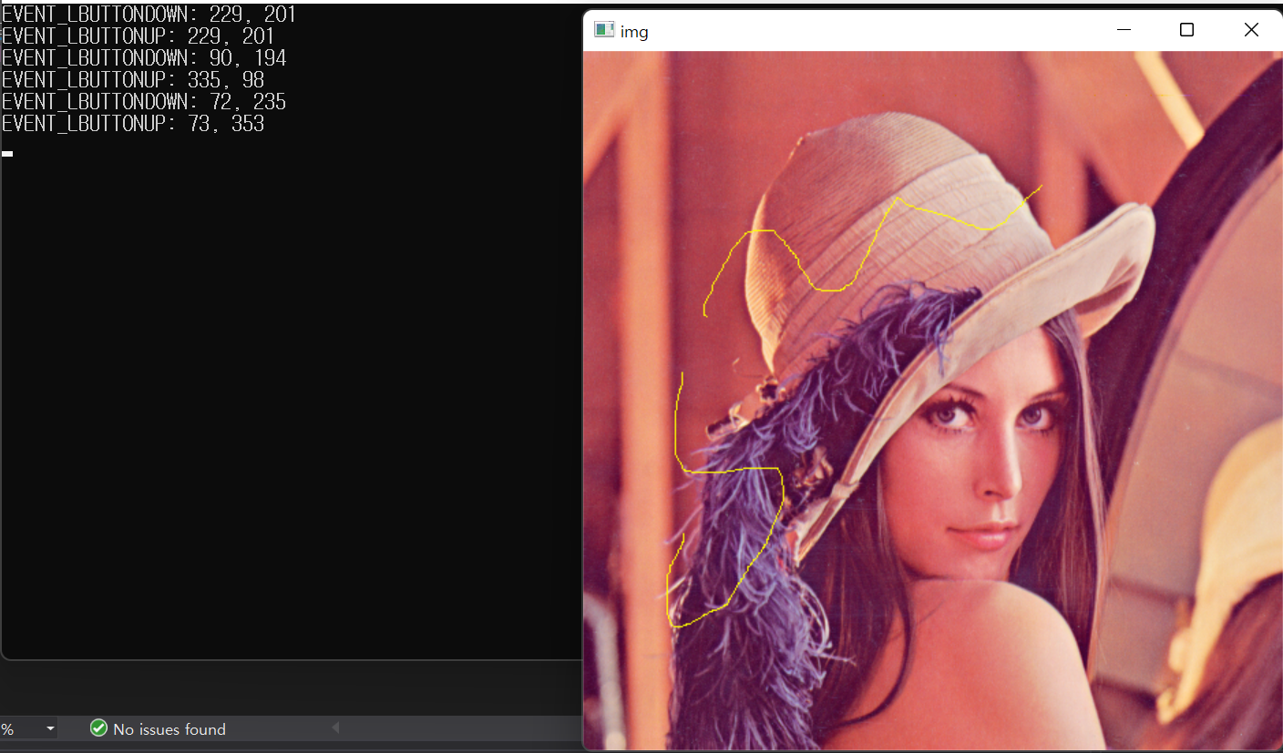 다음 코드는 setMouseCallback() 함수를 사용하여 마우스 이벤트를 처리하는 예제 코드입니다. 이 예제 코드는 마우스 왼쪽 버튼이 눌리거나 떼어진 좌표를 콘솔 창에 출력하고, 마우스 왼쪽 버튼을 누른 상태로 마우스를 움직이면 마우스 움직임의 궤적을 영상 위의 노란색으로 표시합니다.
