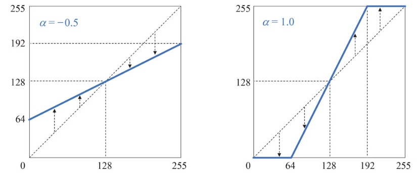 이 수식에서 \(\alpha\)는 -1보다 같거나 큰 실수입니다. 이 수식은 항상 (128, 128) 좌표를 지나가고 \(\alpha\)에 의해 기울기가 변경되는 직선의 방정식입니다. \(\alpha\)의 범위가 \(-1 \leq \alpha \leq 0\)이면 기울기가 0부터 1사이의 직선이 되며, 이는 명암비를 감소시키는 변환 함수가 됩니다. 반면 \(\alpha\)의 범위가 \(\alpha > 0\)이면 기울기가 1보다 큰 직선의 방정식이며, 이는 명암비를 증가시키는 변환 함수가 됩니다. 앞 수식에 의해 계산되는 픽셀 값은 0보다 작거나 255보다 커지는 경우가 발생할 수 있으므로 포화 연산도 함께 수행해야 합니다. 이를 포함한 수식은 다음과 같습니다.