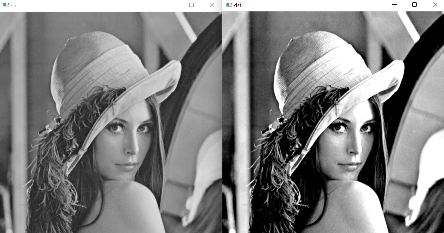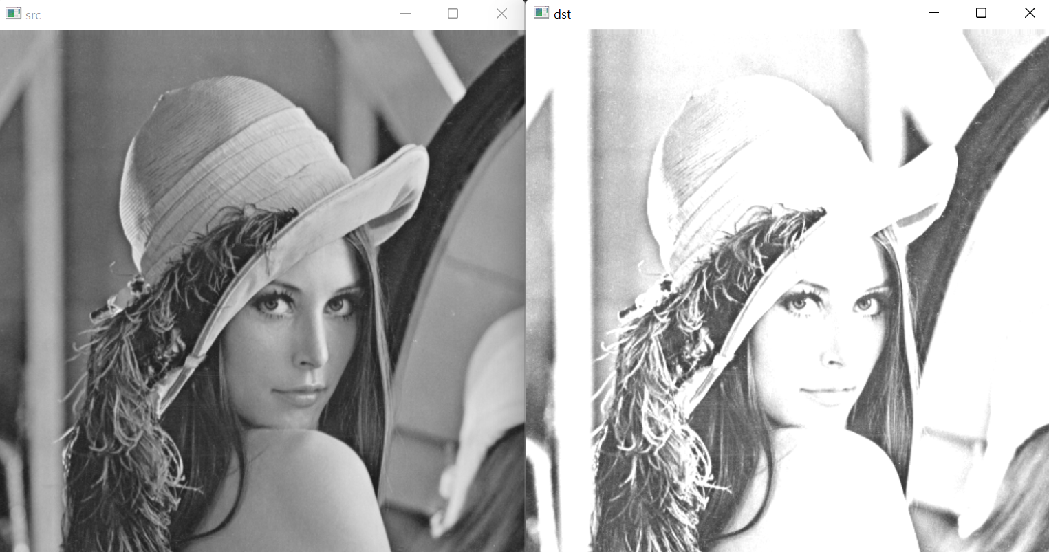 이 식에서 src와 dst는 각각 입력과 출력을 나타내고, \(G_{\text{min}}\)과 \(G_{\text{max}}\)는 입력 영상의 픽셀 값 중에서 가장 큰 그레이스케일 값과 가장 작은 그레이스케일 값을 나타냅니다.