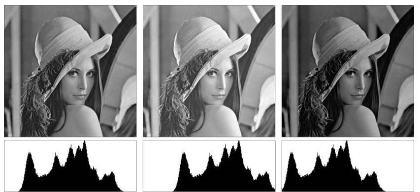 왼쪽 이미지가 원본, 가운데 이미지가 밝기를 증가시킨 이미지, 오른쪽 이미지가 밝기를 감소시킨 이미지입니다. 전체적으로 히스토그램이 왼쪽으로 이동한 것을 확인할 수 있습니다.