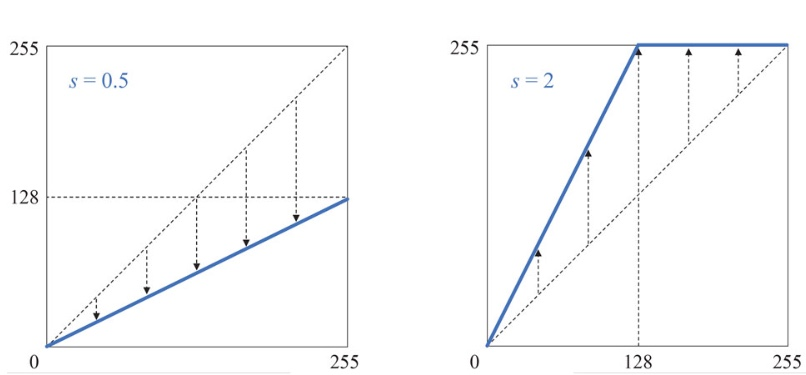 예를 들어, s=2인 경우에 원본 영상에서 밝기가 60이었던 픽셀은 120이 되고, 100이었던 픽셀은 200이 됩니다. 그 결과 두 픽셀의 밝기 차이가 원본 영상에서는 40이었지만, 결과 영상에서는 80으로 증가합니다. 반면 s=0.5인 경우, 밝기 값이 60이었던 픽셀은 30이 되고, 100이었던 픽셀은 50으로 감소합니다. 그 결과 두 픽셀의 밝기 차이는 40에서 20으로 감소합니다.