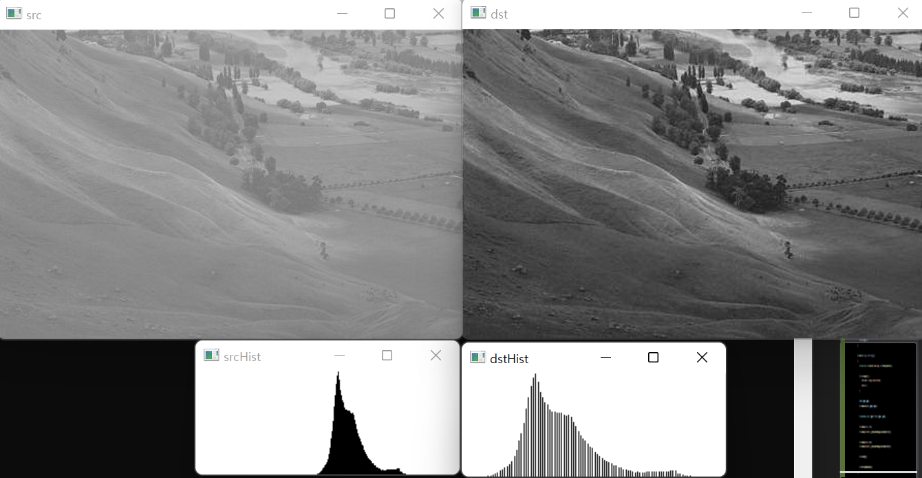 cv::imshow("dstHist", getGrayHistImage(calcGrayHist(dst)));