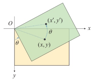 영상의 회전 변환에 의해 입력 영상의 점 (x, y)가 이동하는 점의 좌표 (x', y')는 다음과 같이 삼각함수를 이용하여 구할 수 있습니다.