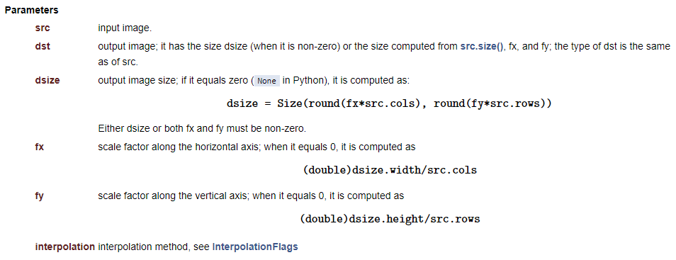 이 함수는 src를 dsize 크기로 확대 또는 축소한 dst 영상을 생성합니다. 결과 영상의 크기는 dsize 인자를 통해 명시적으로 지정할 수도 있고, 또는 가로 방향 및 세로 방향으로의 크기 변환 비율인 fx와 fy 값을 통해 지정할 수도 있습니다. 만약 결과 영상의 크기를 픽셀 단위로 지정하여 크기 변환을 수행하려면 dsize에 0이 아닌 값을 지정하고, fx와 fy는 0으로 설정합니다. 반대로 입력 영상 크기를 기준으로 변환 비율을 지정하여 변환하려면 dsize에는 Size()를 지정하고 fx와 fy에는 0이 아닌 양의 실수를 지정합니다.