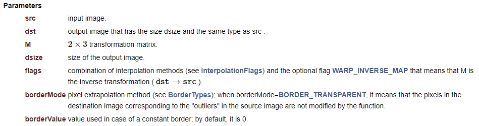 이 함수는 src를 어파인 변환하여 dst를 생성합니다. 이때 전달되는 어파인 변환 함수 M은 CV32FC1 또는 CV_64FC1 타입이어야 하고, 크기는 2x3 이어야 합니다. 어파인 결과 영상의 크기 dsize는 어파인 변환에 따라 사용자가 적절하게 지정해야 하며, Size()를 지정하면 입력과 동일한 크기의 결과 영상을 생성합니다.