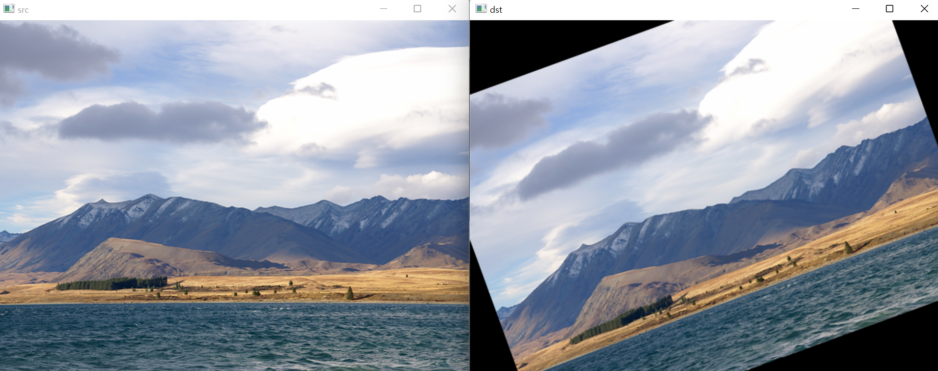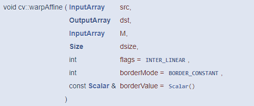 OpenCV는 어파인 변환 행렬을 구하는 함수와 어파인 변환 행렬을 이용하여 실제 영상에 어파인 변환을 수행하는 함수를 모두 제공합니다. 먼저 어파인 변환 행렬을 구하는 함수 이름은 getAffineTransform() 입니다.