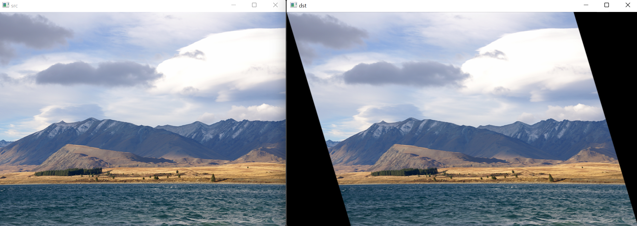 cv::warpAffine(src, dst, M, cv::Size(cvRound(src.cols + src.rows * mx), src.rows));
