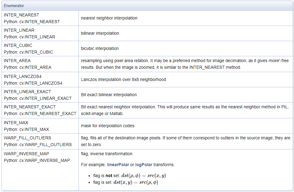 resize() 함수 파라미터 중 interpolation에는 보간법(interpolation) 알고리즘을 나타내는 InterpolationFlags 열거형 상수를 지정합니다. 보간법은 결과 영상의 픽셀 값을 결정하기 위해 입력 영상에서 주변 픽셀 값을 이용하는 방식을 의미하며, resize() 함수에서는 아래의 표에 나타난 알고리즘을 사용할 수 있습니다.
