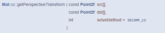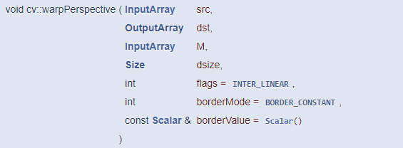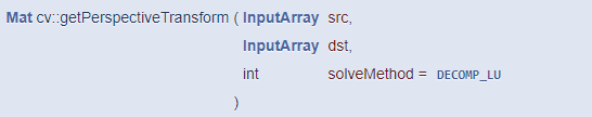 OpenCV는 투시 변환 행렬을 구하는 함수와 이 행렬을 이용하여 실제 영상을 투시 변환하는 함수를 모두 제공합니다. 먼저 투시 변환 행렬을 구하는 함수는 getPerspectiveTransform() 입니다.
