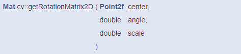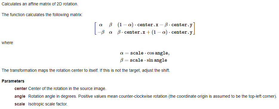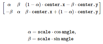 이 함수는 center 점을 기준으로 반시계 방향으로 angle 각도만큼 회전한 후, scale 크기만큼 확대 또는 축소하는 2x3 어파인 변환 행렬을 반환합니다. 만약 시계 방향으로 회전하는 어파인 변환 행렬을 구하고 싶다면 angle에 음수를 지정합니다. 이 함수가 반환하는 어파인 변환 행렬은 다음과 같습니다.