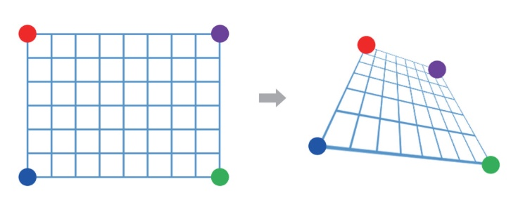 아래 그림은 4개의 점의 이동 관계에 의해 결정되는 투시 변환을 보여줍니다.