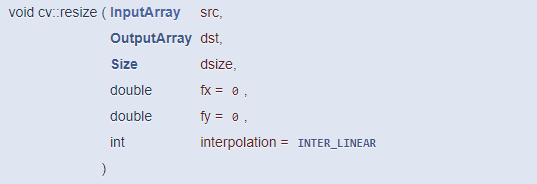 따라서 위와 같은 어파인 변환 행렬을 생성하고 warpAffine() 함수를 이용하면 영상의 크기 변환을 수행할 수 있습니다. 하지만 영상의 크기를 변환하는 작업은 실제 영상 처리 시스템에서 매우 빈번하기 때문에 보다 간단하게 크기를 변경할 수 있는 resize() 함수를 제공합니다.
