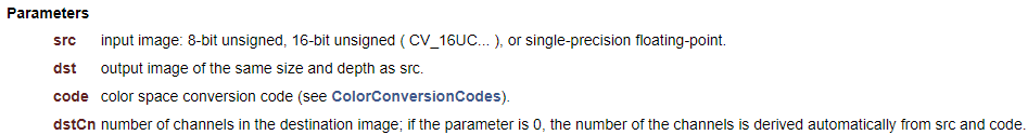 이 함수는 입력 src의 색상 공간을 변환하여 dst를 생성합니다. 어떻게 변환할 지는 code를 통해서 지정하는데, 여기에는 ColorConversionCodes 열거형 상수를 지정할 수 있습니다.