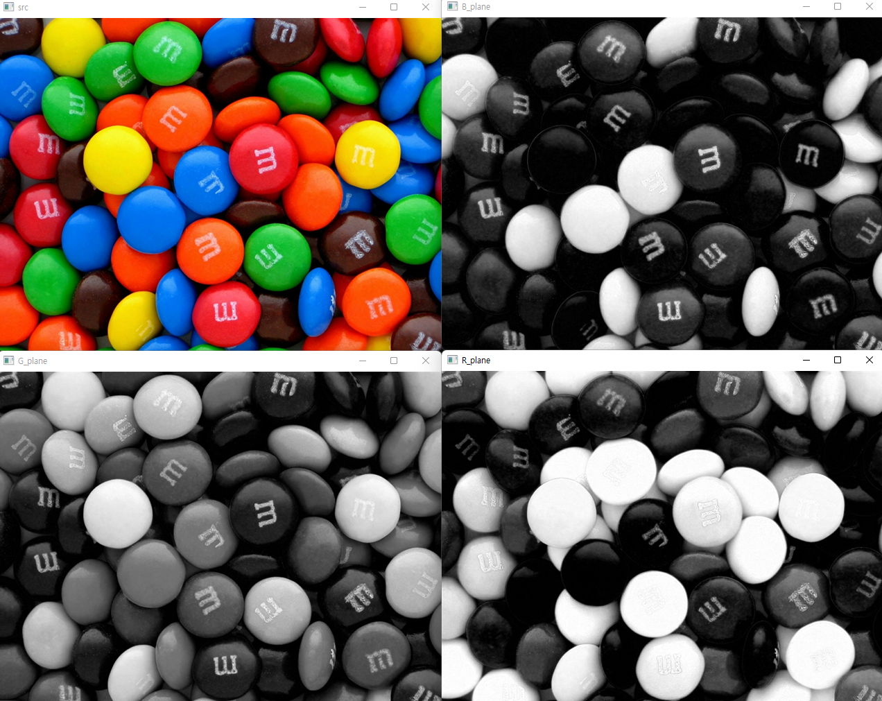 실행 결과는 위와 같습니다. 원본 영상 src에서 파란색 초콜릿 영역은 파란색 성분 값이 크기 때문에 B_plane에서 밝은 흰색으로 표시됩니다. 반면에 노란색 캔디 영역은 빨간색과 녹색 성분 값이 크기 때문에 R_plane과 G_plane에서 밝게 표현됩니다.