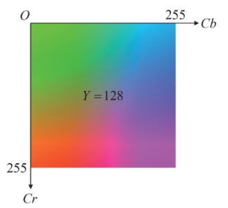 위 이미지는 Y 성분의 값을 128로 고정한 상태에서 Cr과 Cb 값에 따른 색상 표현을 보여줍니다. HSV 색상 공간에서는 H 값만을 이용하여 색 종류를 구분할 수 있었지만, YCrCb 색상 공간에서는 Cr과 Cb를 함께 조합하여 색을 구분합니다.