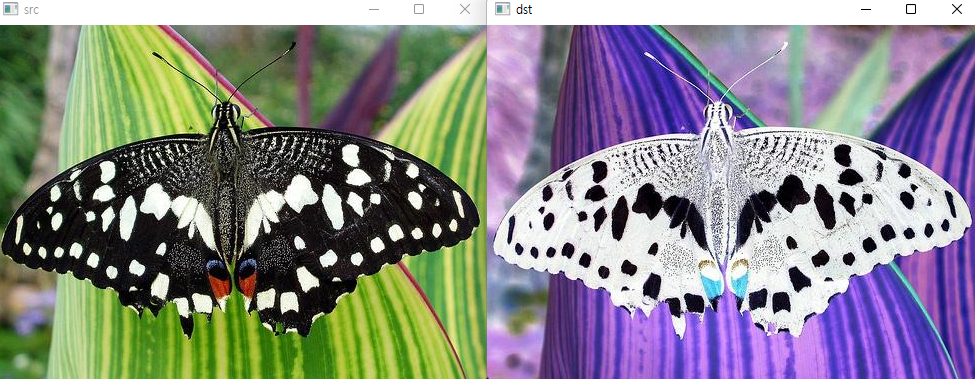 아래 예제 코드는 픽셀 값을 참조하는 방법을 이용하여 컬러 이미지를 반전시켜 화면에 출력합니다. 아래 코드에서는 입력 영상의 모든 픽셀 값을 반전시켜 화면에 출력하며, 각 색상 성분 값을 각각 255 빼는 연산을 수행합니다.