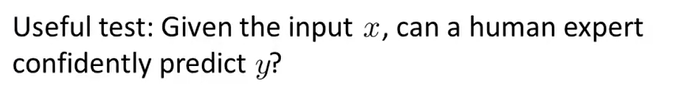 이것을 판단하는 유용한 방법은 input \(x\)가 주어졌을 때, 전문가가 확실히 \(y\)를 예측할 수 있는가는 확인해보는 것이다.