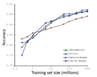 또한, Training Set이 적을 때에 성능이 좋지 않았던 알고리즘이 Training Set이 많아질수록 다른 알고리즘보다 더 좋은 성능을 가질 수 있다는 것을 보여준다.