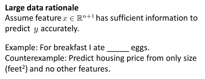 많은 Data를 사용하는 것은 도움이 될 것이다. 우리가 y를 예측하기에 충분한 정보를 가진 features가 있고, 많은 parameters를 가지고 학습 알고리즘을 사용한다고 가정해보자(maybe logistic regression or linear regression with a large number of features. Or neural network with many hidden units)