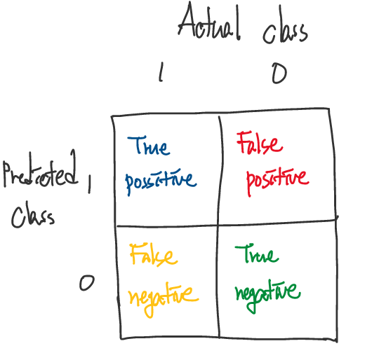 그리고, 우리가 예측한 결과 Class를 Predicted Class로, 실제 결과 Class를 Actual Class로 정의하고, Precision과 Recall을 정의하면 아래와 같다.