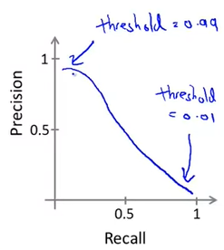 \(h_\theta(x)\)에 따라서 약간씩 다르지만, Precision과 Recall의 관계를 그래프로 표현하면 대체적으로 아래와 같이 표현된다.