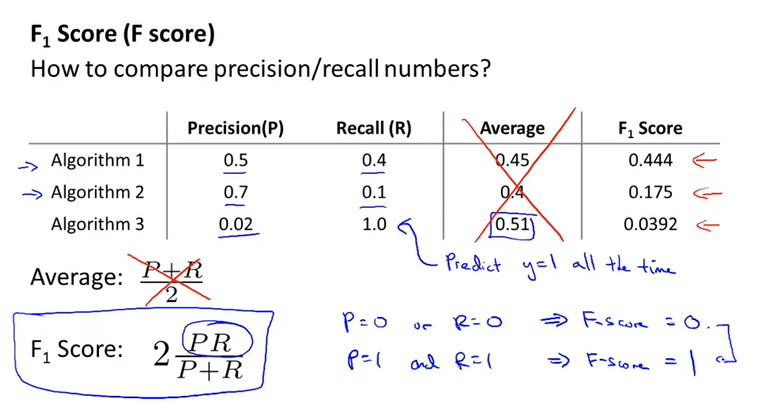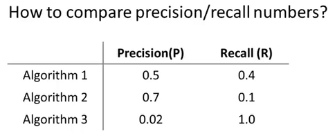 성능을 평가하기 위한 지표로 P와 R로 나타난다. 알고리즘을 평가하기에 한 가지의 지표로 판단하는 것이 훨씬 더 빠르고 도움이 되기 때문에 우리는 Single real number evaluation metric 방법을 사용할 것이다.
