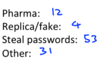 먼저 어떤 종류의 email이 Error를 발생하는지 확인해야한다. 여기서는 Pharmacy, Fake, Steal password 등의 종류가 있었고, 그 개수는 아래와 같다.