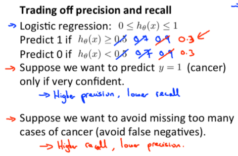 하지만 우리가 매우 확실할 때만, y = 1이라고 결정하고 싶다면 Threshold 값을 0.5보다 더 높게 설정(0.7 or 0.9)하면 된다. 이렇게 되면 Higher Precision, Lower Recall을 갖게될 것이다.