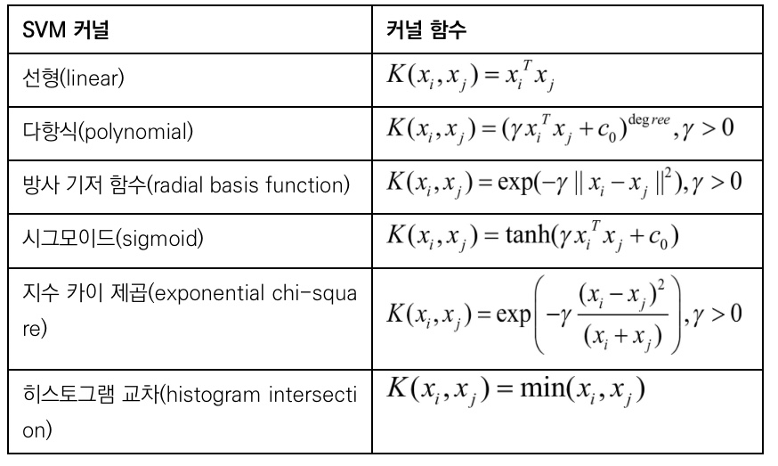 SVM 알고리즘에서 사용할 수 있는 커널 함수의 종류는 아래와 같습니다.