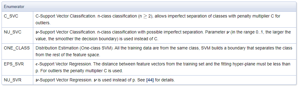 이 함수의 kernelType 인자에는 SVM::KernelTypes 열거형 상수 중 하나를 지정할 수 있습니다.