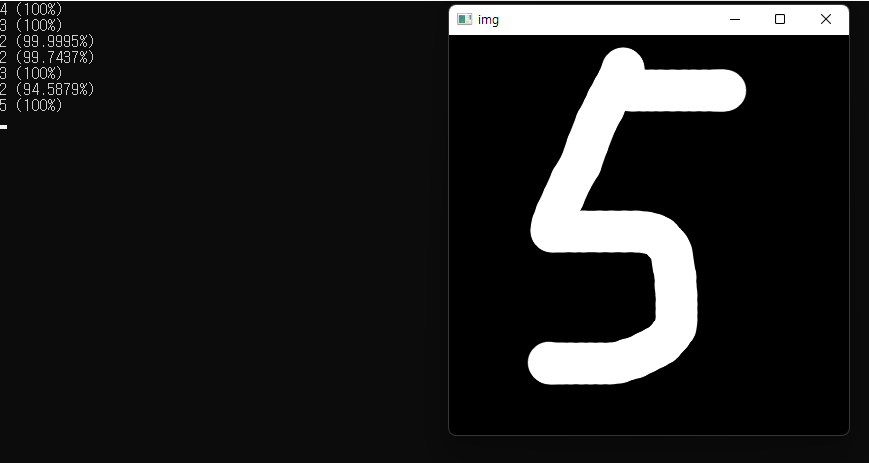 tensorflow로 학습시킨 모델 정보가 저장된 frozen_graph.pb 파일을 통해 Net 객체를 생성하고, 마우스로 그린 숫자를 판별합니다.