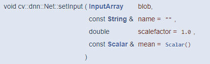 blobFromImage() 함수로 생성한 블롭 객체는 Net::setInput() 함수를 이용하여 네트워크 입력으로 설정합니다.