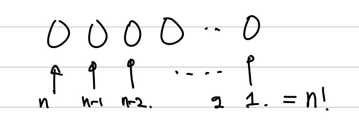 첫 번째 위치에 올 수 있는 요소는 n개가 있고, 두 번째 위치는 (n-1)개, 세 번째 위치는 (n-2)개가 올 수 있습니다. 따라서, 전체 나열할 수 있는 경우의 수는 \(n(n-1)(n-2)\cdots(2)(1)\)이 되며, 이를 n 팩토리얼(factorial), \(n!\)로 정의합니다.