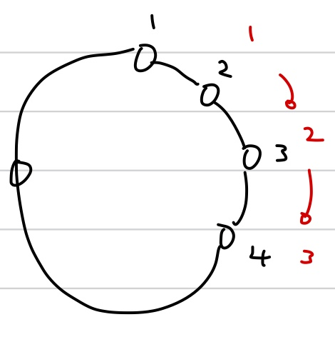 원순열에서 나열했을 때, 순서를 그대로 유지하면서 위치를 shift하는 것은 동일하다고 볼 수 있습니다. 따라서 shift한 결과(빨간색 순서)는 동일한 것이고, 이렇게 동일한 경우가 n가지가 존재합니다. 따라서, 원순열에서 나열할 수 있는 경우의 수는 다음과 같습니다.
