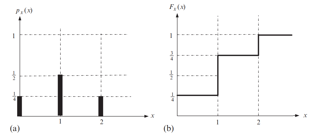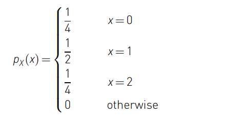 \[P_X(x) = \frac{1}{4}\delta(x) + \frac{1}{2}\delta(x-1) + \frac{1}{4}\delta(x-2)\]