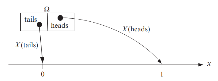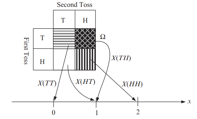 \[\begin{align*} \{TT\} \rightarrow 0 && P(0) = P(\{TT\}) = 1/4 \\ \{HT, TH\} \rightarrow 1 && P(1) = P(\{HT, TH\}) = 1/2 \\ \{HH\} \rightarrow 2 && P(2) = P(\{HH\}) = 1/2 \end{align*}\]