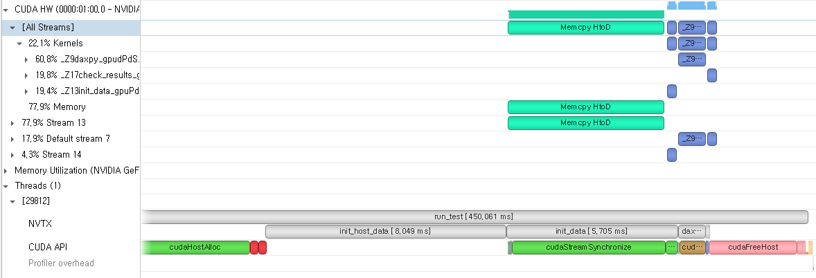 위 코드를 컴파일 한 뒤, Nsight System으로 프로파일링한 결과는 다음과 같습니다.