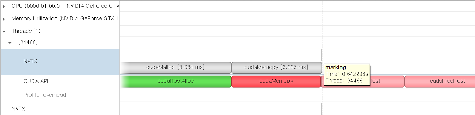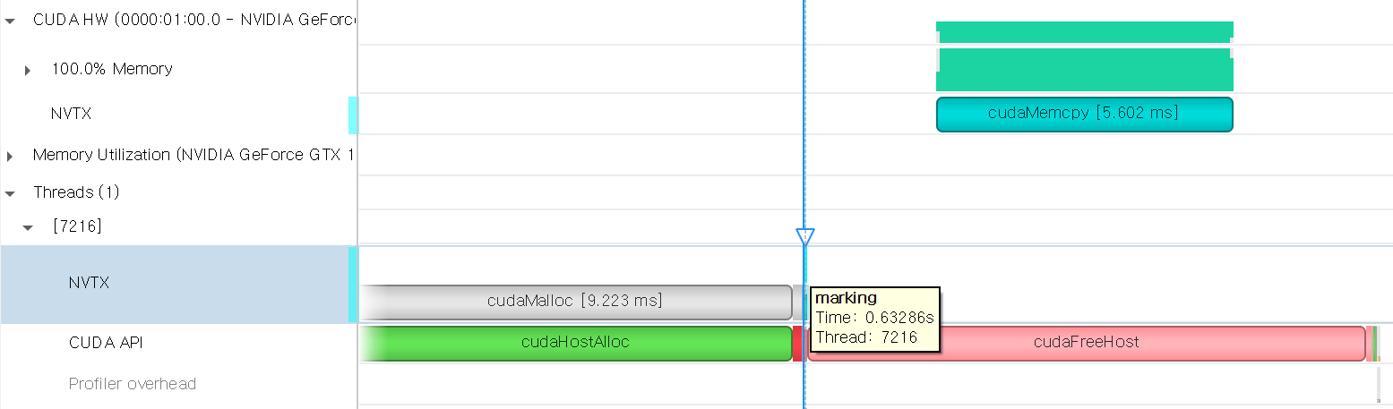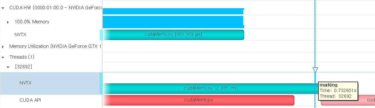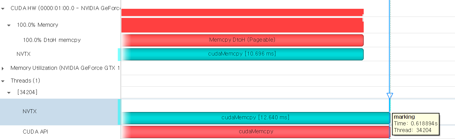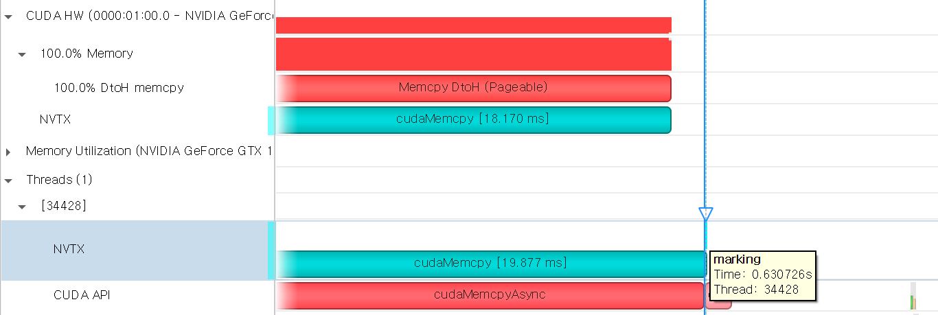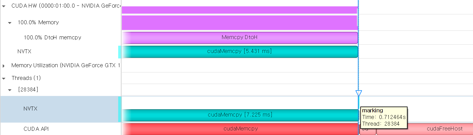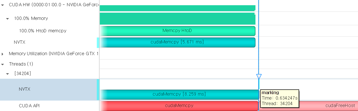 "marking"이 cudaMemcpy가 끝나기 전에 마킹된 것을 볼 수 있습니다. 즉, 이 경우에는 비동기로 동작한다는 것을 확인할 수 있습니다.