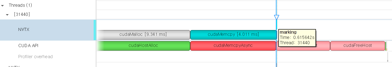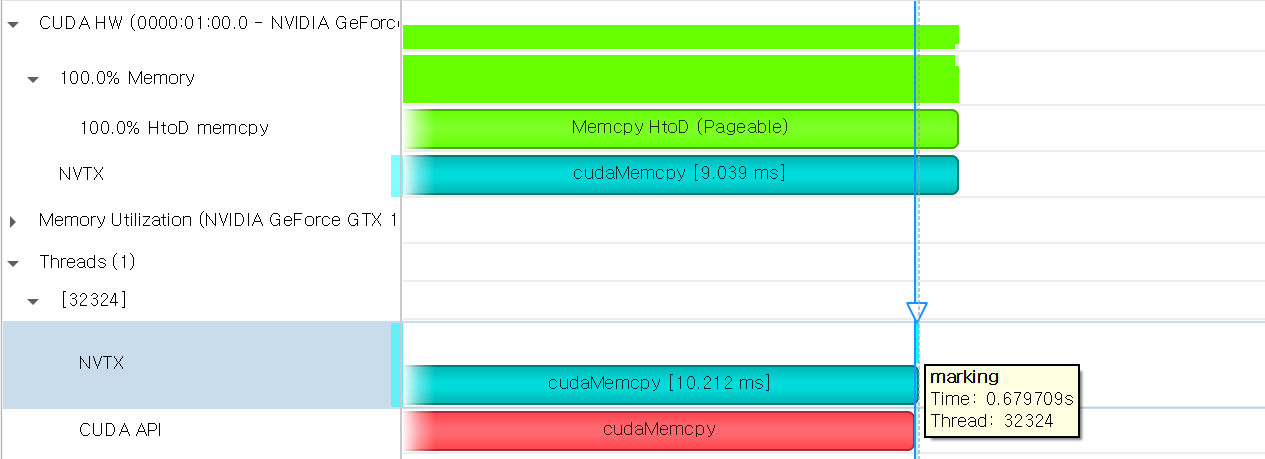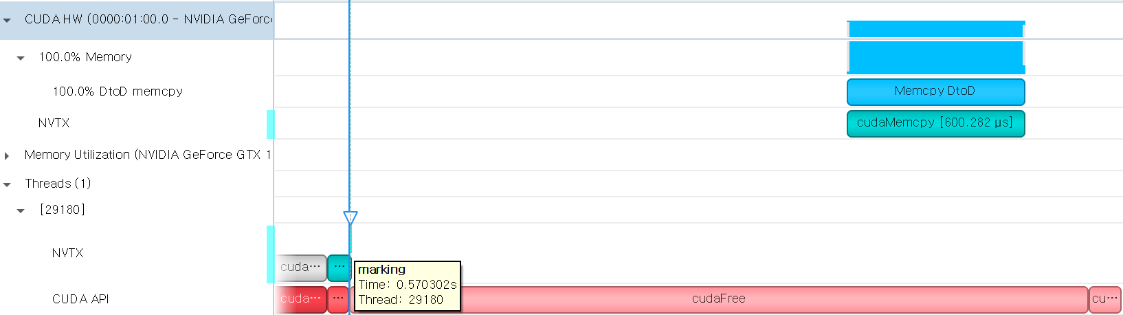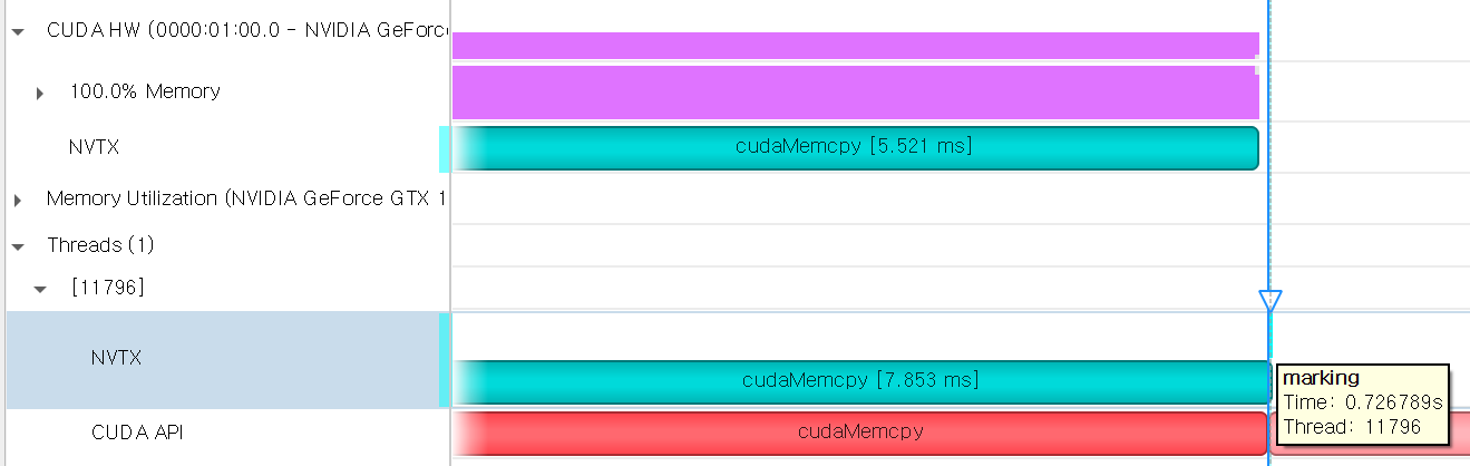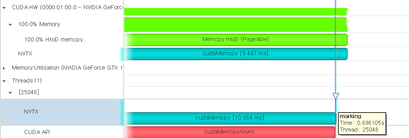예상한 대로 비동기로 수행되기 때문에 "marking"이 CUDA HW에서의 cudaMemcpy가 끝나기도 전에 마킹되는 것을 확인할 수 있습니다.